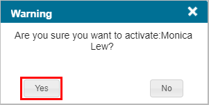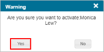 - A Warning message appears asking you to confirm that you want to activate the user.