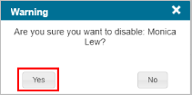 - Click Yes to confirm that you want to disable the user.